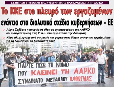 Δ. Κουτσούμπας: Η κυβέρνηση ΝΔ ετοιμάζεται σήμερα να ολοκληρώσει το εγκληματικό σχέδιο για τη ΛΑΡΚΟ, που υλοποίησαν βήμα βήμα όλες οι μέχρι σήμερα κυβερνήσεις και έχει στόχο την παραπέρα απαξίωση, την ιδιωτικοποίηση, ακόμα και το οριστικό κλείσιμο της επιχείρησης. Στα χέρια της εργατικής τάξης, των εργαζομένων της χώρας, η ΛΑΡΚΟ θα είναι μεγάλο εφόδιο για την ικανοποίηση των μεγάλων αναγκών του ελληνικού λαού