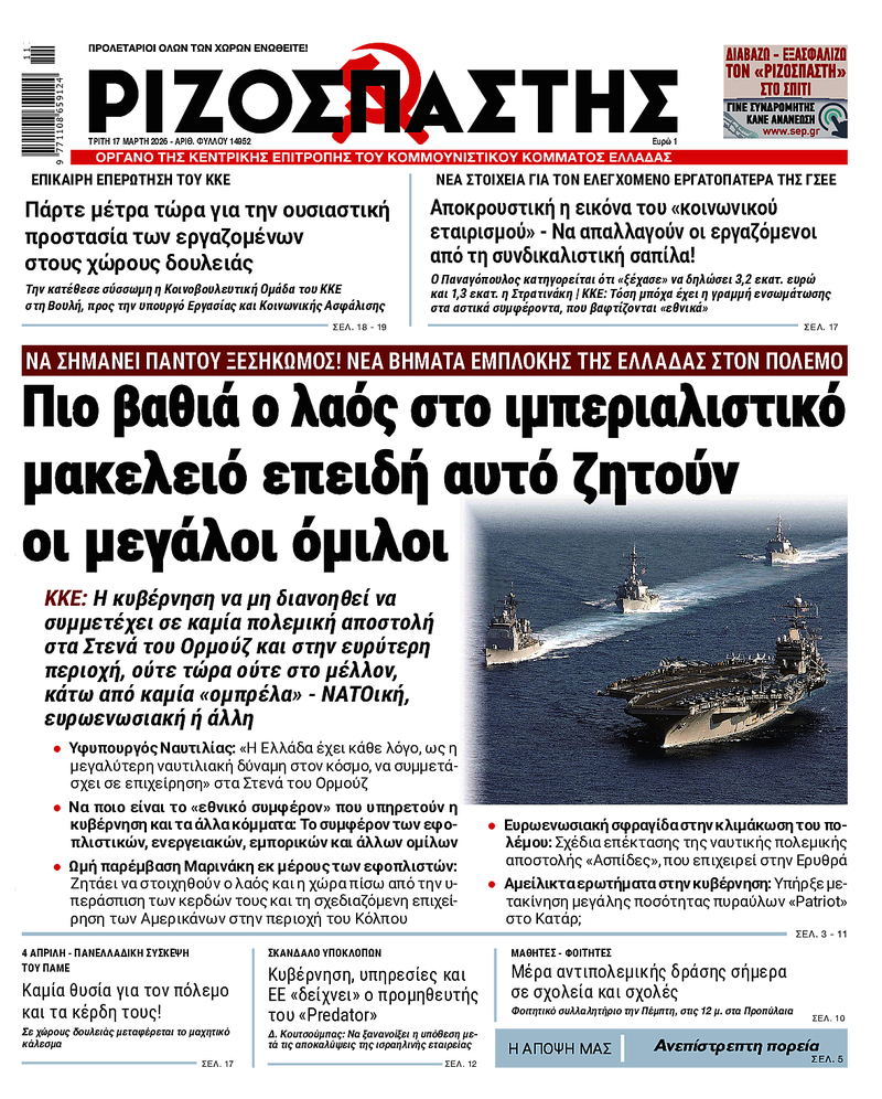ΚΚΕ: Η κυβέρνηση να μη διανοηθεί να συμμετέχει σε καμία πολεμική αποστολή στα Στενά του Ορμούζ και στην ευρύτερη περιοχή, ούτε τώρα ούτε στο μέλλον, κάτω από καμία «ομπρέλα» - ΝΑΤΟική, ευρωενωσιακή ή άλλη
