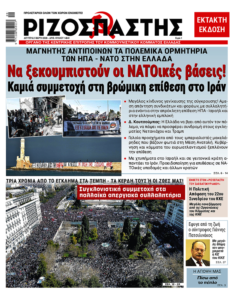 Μπροστά στον κίνδυνο γενίκευσης του ιμπεριαλιστικού πολέμου και την εμπλοκή της χώρας που βαθαίνει, μεγαλώνει η ευθύνη και η ανάγκη να βγουν στο προσκήνιο οι λαοί και με την πάλη τους να σφραγίσουν τις εξελίξεις. Η χτεσινή άμεση απάντηση των συνδικάτων στη χώρα μας δείχνει τον δρόμο!
