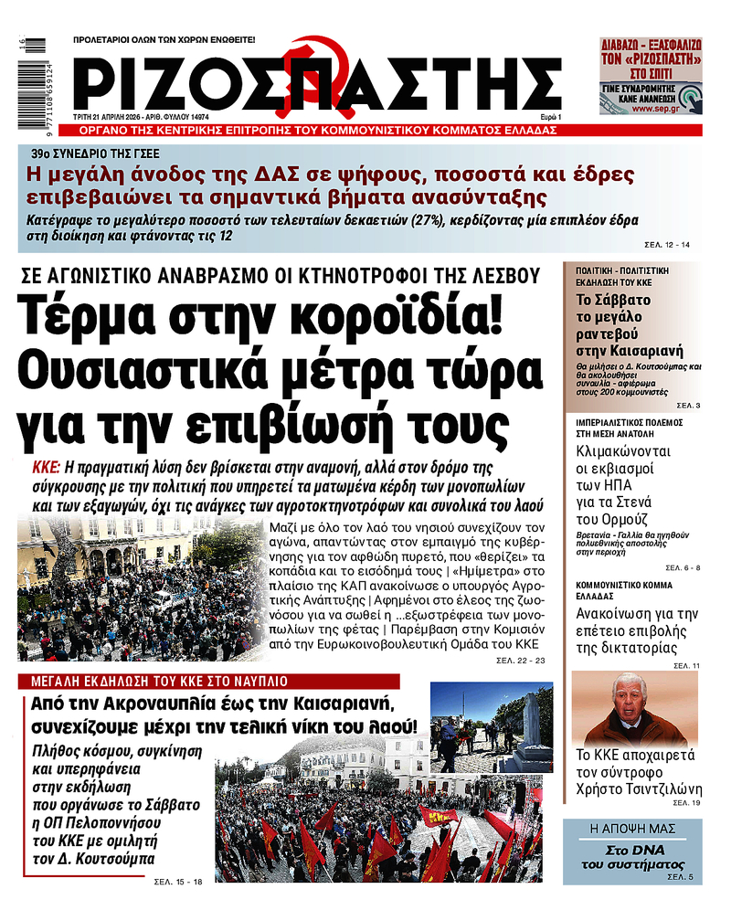 ΚΚΕ: Η πραγματική λύση δεν βρίσκεται στην αναμονή, αλλά στον δρόμο της σύγκρουσης με την πολιτική που υπηρετεί τα ματωμένα κέρδη των μονοπωλίων και των εξαγωγών, όχι τις ανάγκες των αγροτοκτηνοτρόφων και συνολικά του λαού