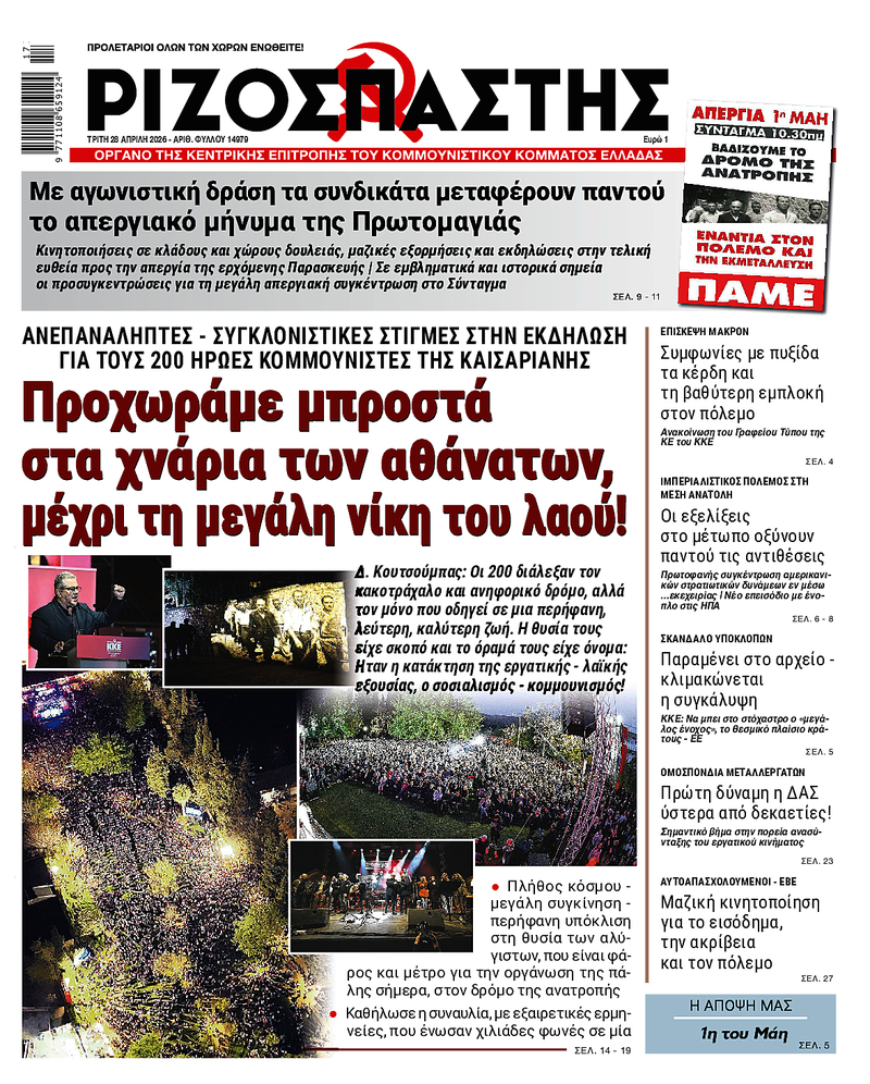 Δ. Κουτσούμπας: Οι 200 διάλεξαν τον κακοτράχαλο και ανηφορικό δρόμο, αλλά τον μόνο που οδηγεί σε μια περήφανη, λεύτερη, καλύτερη ζωή. Η θυσία τους είχε σκοπό και το όραμά τους είχε όνομα: Ηταν η κατάκτηση της εργατικής - λαϊκής εξουσίας, ο σοσιαλισμός - κομμουνισμός!