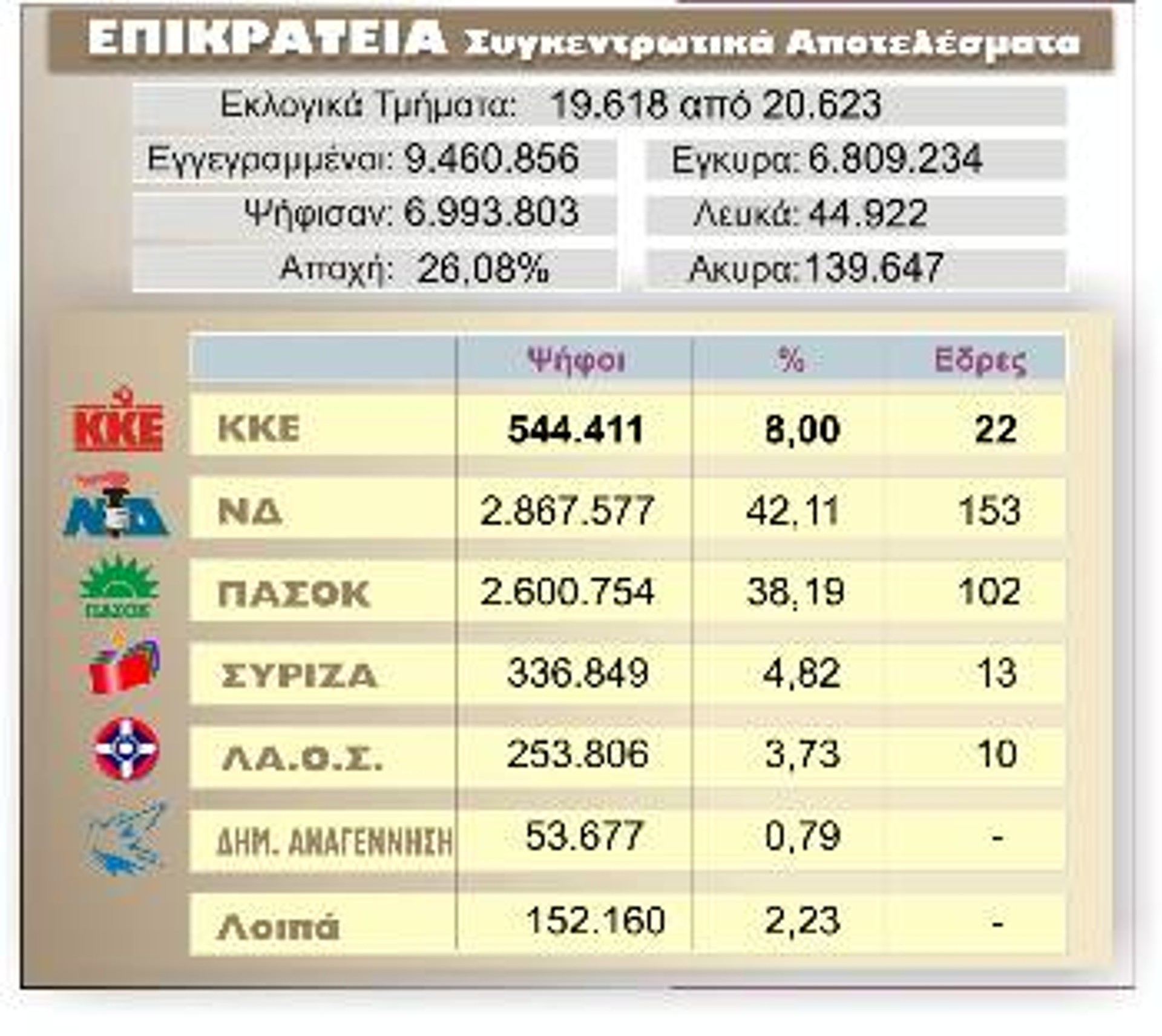 Μεγάλη πτώση του εκλογικού ποσοστού και «ισχνή» η αυτοδυναμία για τη ΝΔ. Σοβαρή εκλογική ήττα υπέστη το ΠΑΣΟΚ.