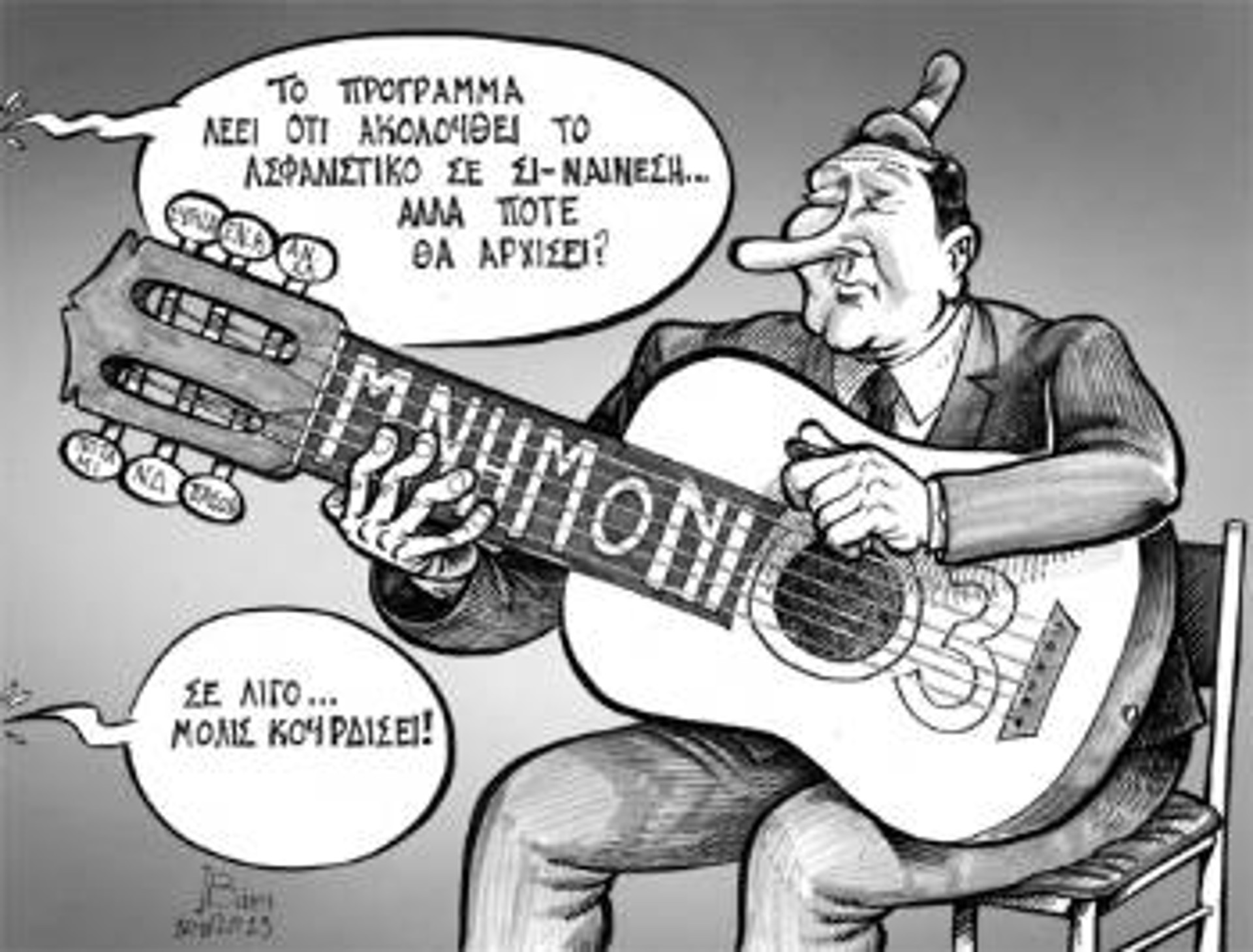 Το παραπάνω είναι απόσπασμα ρεπορτάζ απ' τα όσα διημείφθησαν εντός του Προεδρικού Μεγάρου και μεταξύ των πολιτικών αρχηγών που πήραν μέρος στη σύσκεψη. Αλλο ρεπορτάζ καταγράφει την εξής στιχομυθία: «Σταύρος Θεοδωράκης: Οταν ήσουν στην αντιπολίτευση, δεν συναινούσες σε τίποτα. Αλέξης Τσίπρας: Ολοι - όταν είμαστε στην αντιπολίτευση - κάνουμε τις υπερβολές μας. Ετσι θα συνεχίσουμε;».
