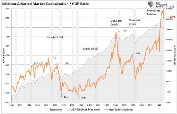 Για παράδειγμα ο λεγόμενος «δείκτης Μπάφετ», που θεωρείται από αστούς οικονομολόγους πρόδρομος δείκτης της καπιταλιστικής κρίσης (αναλύει την κεφαλαιοποίηση της αγοράς όλων των εισηγμένων στο χρηματιστήριο μετοχών στις ΗΠΑ και τη συγκρίνει με το ΑΕΠ, «απηχεί» δηλαδή με έναν τρόπο τη διόγκωση του πλασματικού κεφαλαίου) βρίσκεται πλέον στο 219% του ΑΕΠ. Πρόκειται για «ιστορικά υψηλό» και για να έχει κανείς ένα μέτρο σύγκρισης, υπερδιπλάσιος από την κρίση του 2008: Τότε ο δείκτης αυτός ήταν μόλις στο 105% του ΑΕΠ, ενώ στο προηγούμενο «ιστορικά υψηλό», στην κρίση του 2000 ο δείκτης αυτός ήταν στο 138%.