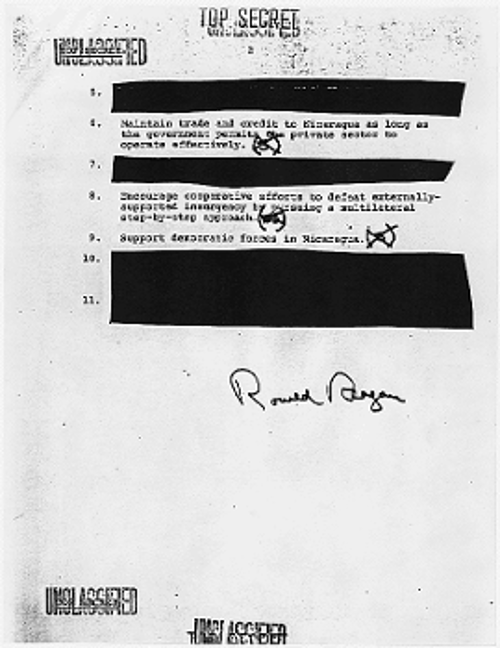 Προκειμένου η κυβέρνηση Ρίγκαν να παρακάμψει τις προσπάθειες του αμερικανικού Κογκρέσου να αποτρέψει την CIA και άλλες υπηρεσίες να χρησιμοποιούν κονδύλια «με σκοπό την ανατροπή της κυβέρνησης της Νικαράγουας» - για λόγους φυσικά ενδοαστικών αντιθέσεων - ίδρυσε μέσω της CIA μυστικά δίκτυα χρηματοδότησης των Κόντρας. Ενα μέρος των χρημάτων προήλθε από παράνομες πωλήσεις όπλων στο Ιράν (το διαβόητο σκάνδαλο Ιράν - Κόντρα). Ενα άλλο μέρος προήλθε από τη διακίνηση ναρκωτικών.