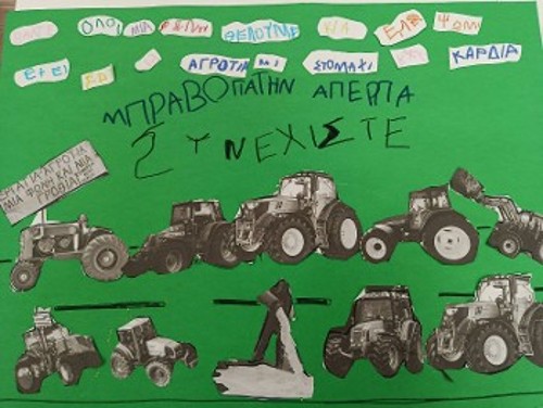 Σωματεία εκπαιδευτικών στην Αττική με ψηφίσματα εκφράζουν τη στήριξή τους, απορρίπτουν τις συκοφαντίες και την προσπάθεια ενεργοποίησης του «κοινωνικού αυτοματισμού», ζητούν η κυβέρνηση τώρα να δώσει απαντήσεις και να ικανοποιήσει τα δίκαια αιτήματα αυτού του αγώνα, που συνεχίζεται εδώ και έξι βδομάδες. Οργανώνουν περιοδείες στα σχολεία, δυναμώνοντας τη συζήτηση για την πολιτική που τα δίνει όλα στους λίγους και τσακίζει τους πολλούς. Καλούν να πολλαπλασιαστούν οι πρωτοβουλίες μέσα στις σχολικές αίθουσες μαζί με τους μαθητές, οι οποίοι συμμετέχουν με ενθουσιασμό, ενώ ιδιαίτερα θετικά είναι και τα σχόλια από την πλευρά των γονιών. «Είναι ήδη συγκινητική η ανταπόκριση των μαθητών, που μέσα από τις δημιουργίες και τις δράσεις τους εκδηλώνουν τη συμπαράστασή τους στο δίκιο της αγωνιζόμενης αγροτιάς!», επισημαίνεται σε ψηφίσματα σωματείων εκπαιδευτικών. Ανταπόκριση που εκφράζεται στα γράμματα που μαθητές έγραψαν από καρδιάς με παραλήπτες τους αγωνιζόμενους στα μπλόκα, με δημιουργίες όπως ζωγραφιές, κολάζ κ.λπ. «Ξέρω ότι παλεύετε και για εμάς και για εσάς... Κάντε κουράγιο, όλα θα πάνε καλά. Να ξέρετε ότι είμαι πάντα ευγνώμων που υπάρχουν άνθρωποι σαν και εσάς, που παλεύουν, που δουλεύουν σκληρά για να έχουμε εμείς φρέσκα φρούτα και λαχανικά», έγραψε ένας μαθητής. Ζωγραφιές με τρακτέρ, εικόνες από το χωράφι, πλαισιωμένες με λόγια γνήσιας αλληλεγγύης, έχουν στολίσει τις τάξεις αλλά και τα κάγκελα των σχολείων, για να τις μοιραστούν με τη γειτονιά.