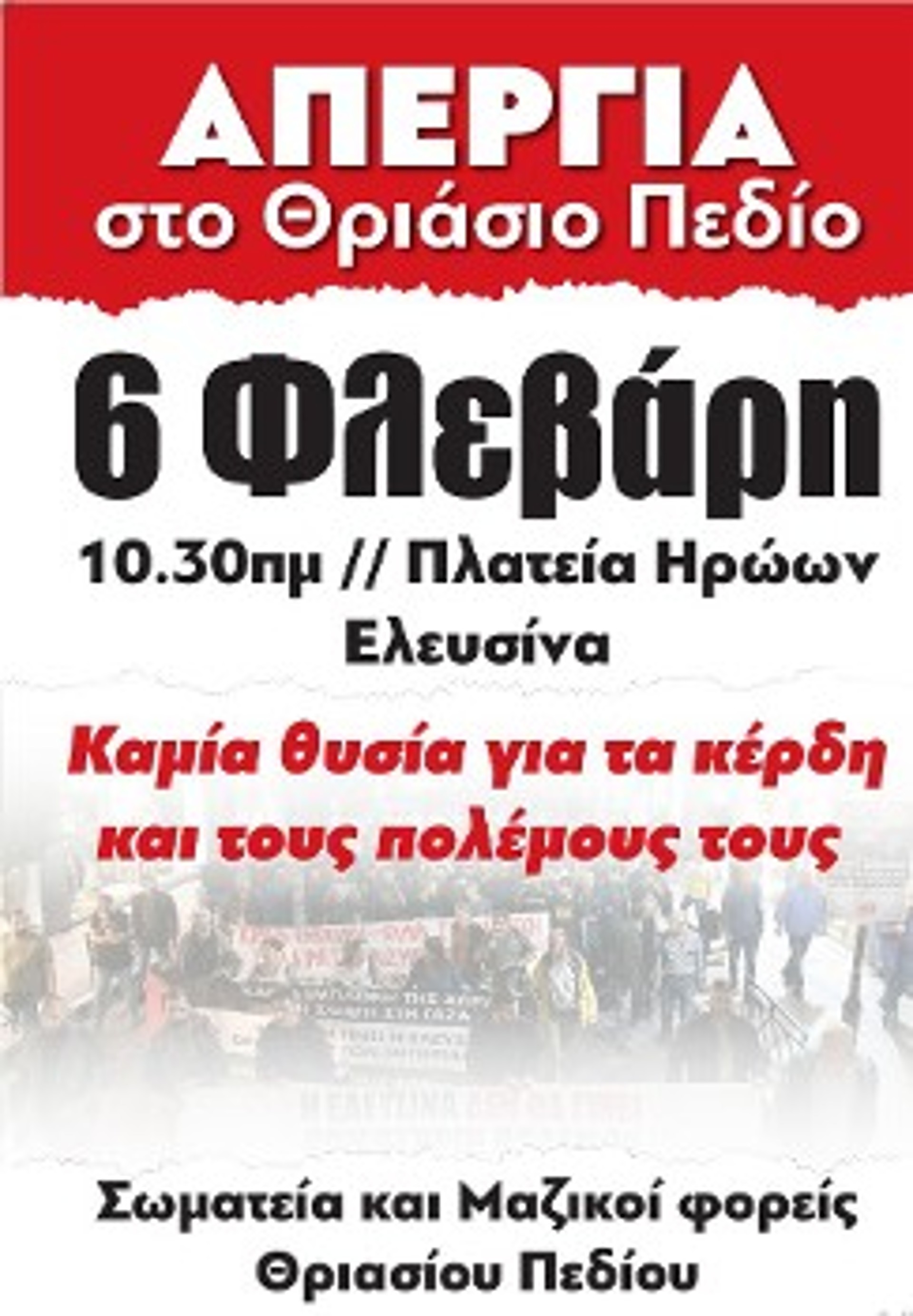 «Στις 6 Φεβρουαρίου απεργούμε γιατί δεν αντέχουμε άλλο. Δεν θα δεχτούμε να ζούμε χειρότερα από τον προηγούμενο αιώνα. Απεργούμε γιατί δεν αποδεχόμαστε αυτήν την ανασφάλεια και τους τεράστιους κινδύνους που μας επιβάλλουν ως "κανονικότητα"», αναφέρει το Εργατικό Κέντρο Πειραιά, αναδεικνύοντας ότι «η μετατροπή της οικονομίας σε πολεμική, τα 800 δισ. ευρώ που μαζεύει η ΕΕ, τα 27 δισ. ευρώ που θα κλέψει από τον δικό μας κόπο και ιδρώτα η κυβέρνηση της ΝΔ από τα ασφαλιστικά ταμεία, με την ουσιαστική συμφωνία των άλλων αστικών κομμάτων, θα πάνε για να μπορέσει το κεφάλαιο να ξεπεράσει την κρίση που βλέπει ότι έρχεται και να τρέξει την πολεμική προετοιμασία. Θα πάνε για τους ιμπεριαλιστικούς ανταγωνισμούς και σχεδιασμούς στην κούρσα του ανταγωνισμού ανάμεσα σε ΗΠΑ - ΝΑΤΟ - ΕΕ από τη μία και Κίνα - Ρωσία από την άλλη. Τα παραπάνω καμία σχέση δεν έχουν με την ασφάλεια των λαών που επικαλούνται. Το αντίθετο!