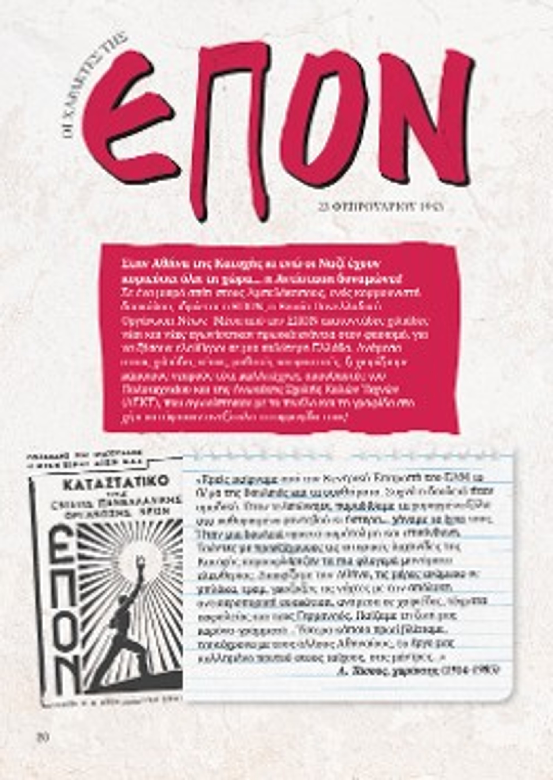 Την ίδια περίοδο με αφορμή την ίδρυση της ΕΠΟΝ και τις σελίδες του τεύχους του περιοδικού που κυκλοφορεί για την ΕΠΟΝ και τους χαράκτες της Αντίστασης θα πραγματοποιηθεί ανάλογη δράση και στη Θεσσαλονίκη.