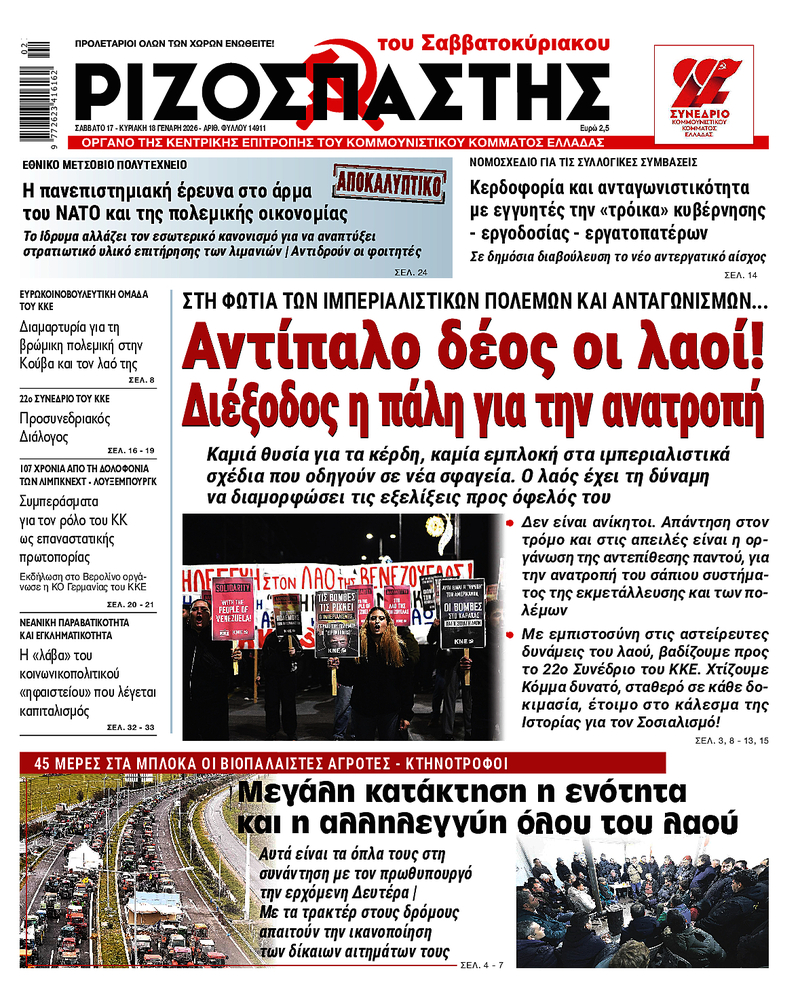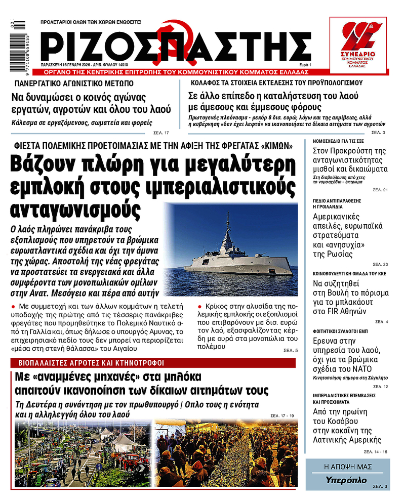 Καμιά θυσία για τα κέρδη, καμία εμπλοκή στα ιμπεριαλιστικά σχέδια που οδηγούν σε νέα σφαγεία. Ο λαός έχει τη δύναμη να διαμορφώσει τις εξελίξεις προς όφελός του