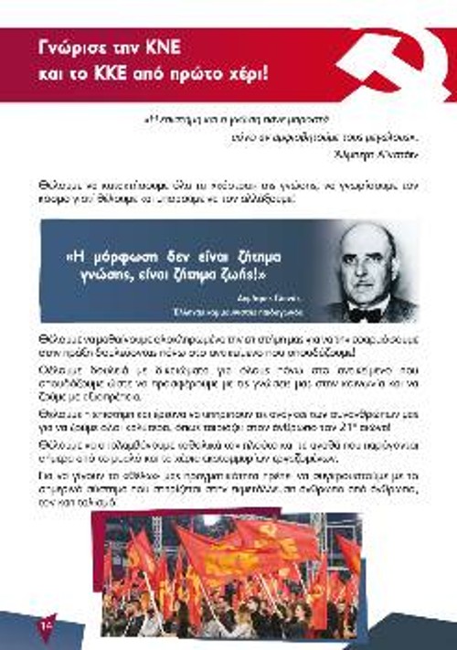 Με την πρωτοπόρα παρέμβαση της ΚΝΕ και άλλων αγωνιστών υπάρχουν φοιτητικοί σύλλογοι που είναι δίπλα σε κάθε φοιτητή, στην πρώτη γραμμή του αγώνα ολόκληρου του φοιτητικού κινήματος. Δεν είναι τυχαίο ότι στην πλειοψηφία αυτών των συλλόγων είναι 1η δύναμη η Πανσπουδαστική ΚΣ, το ψηφοδέλτιο που στηρίζουν οι δυνάμεις της ΚΝΕ και χιλιάδες ακόμα αγωνιστές σε όλη την Ελλάδα».
