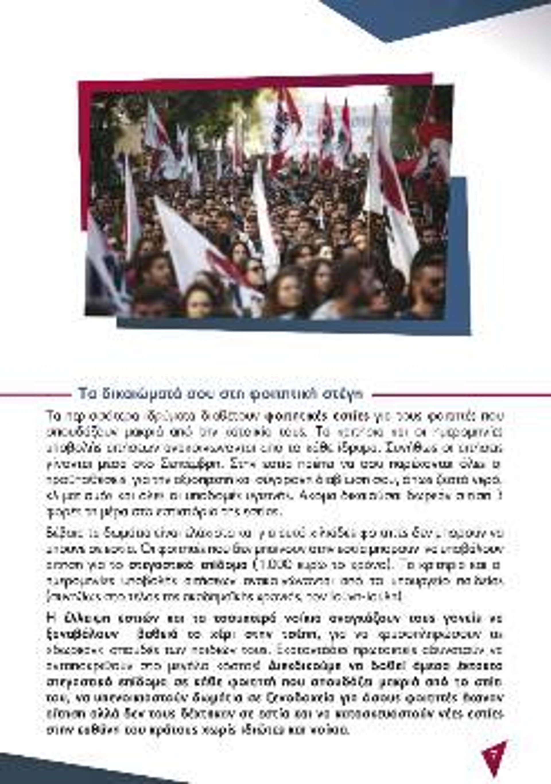 «Το μέλλον είναι μπροστά σου, μην χαρίσεις τα δικαιώματά σου σε κανέναν! Φρόντισε να πάρεις όση περισσότερη γνώση και εφόδια για το μέλλον μπορείς. Εχε όμως υπόψη ότι μόνο αυτό δεν φτάνει. Πάλεψε για τα δικαιώματά σου, γιατί τίποτα δεν χαρίζεται!», τονίζεται χαρακτηριστικά στην αρχή της μπροσούρας και υπογραμμίζεται η σημασία της αλληλεγγύης και του συλλογικού αγώνα.