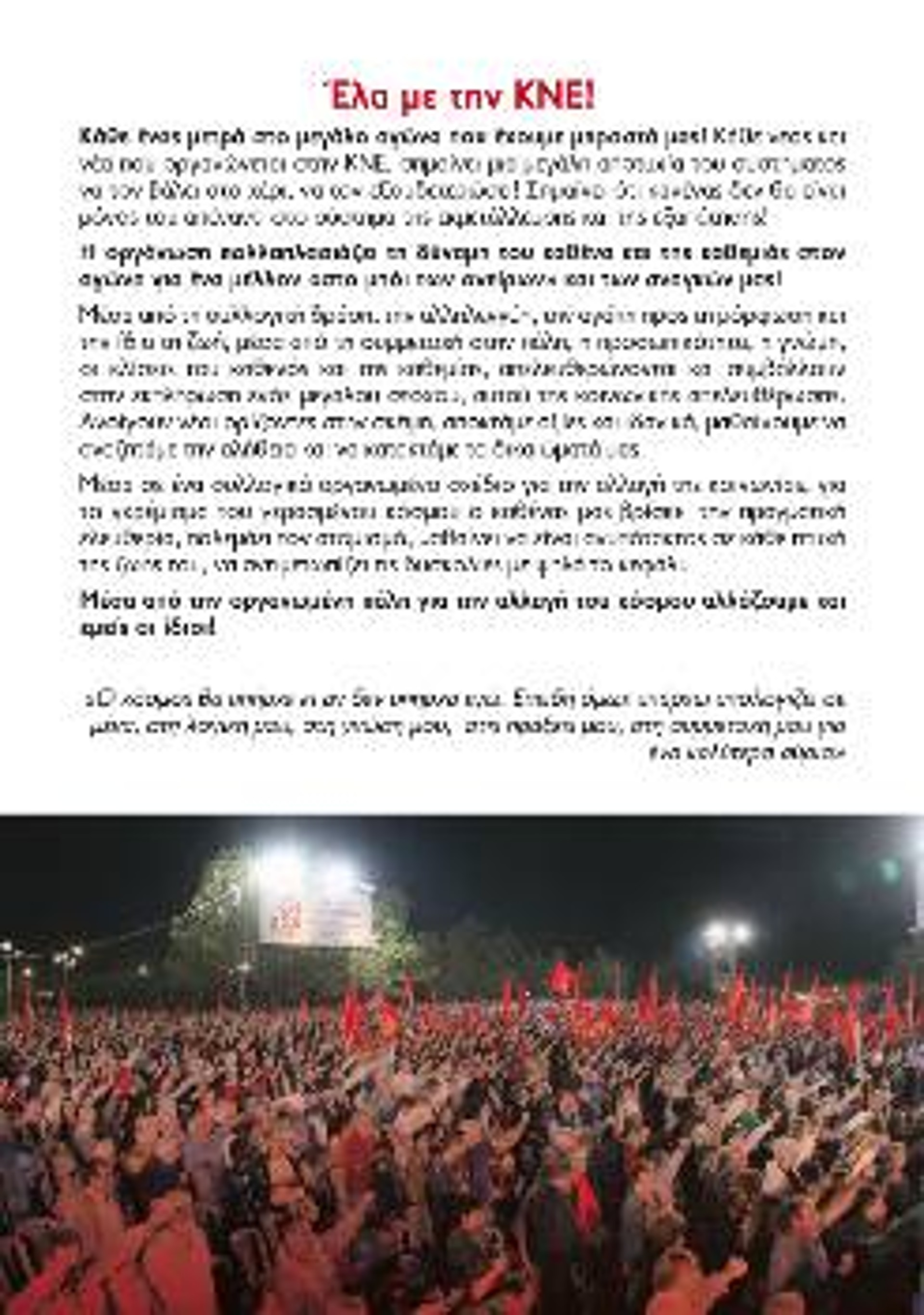Κλείνοντας, η ΚΝΕ αξιοποιεί ρήσεις του Αϊνστάιν, του Γληνού, στίχους του Χικμέτ κ.ά. και καλεί τους πρωτοετείς να γνωρίσουν από πρώτο χέρι τις θέσεις της, τους καλεί σε συμπόρευση στον αγώνα για την κατάργηση της εκμετάλλευσης, τονίζοντας μεταξύ άλλων: