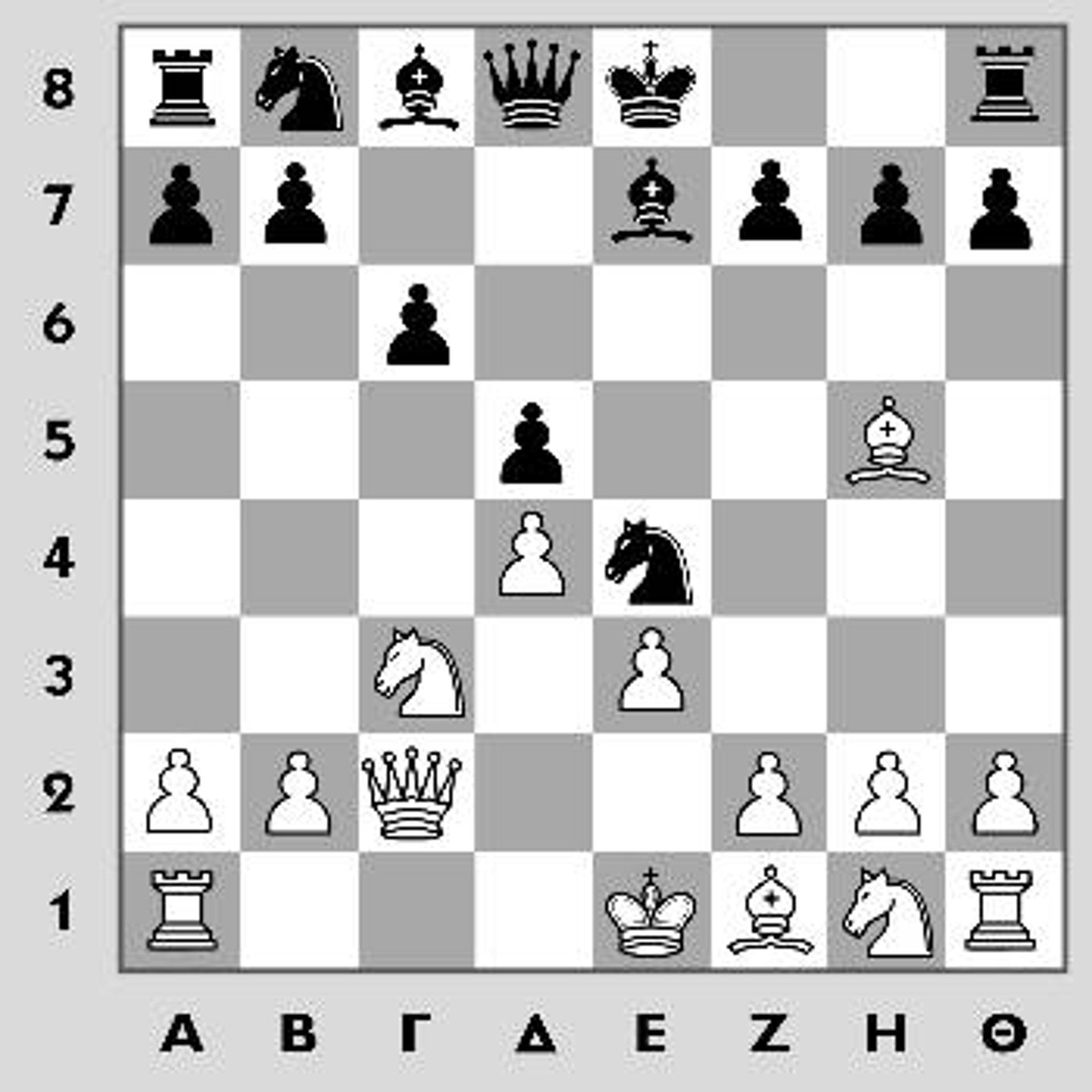 1. ε4 γ5 2. Ιζ3 Ιγ6 3. Αβ5 ε6 4. Αxγ6 βxγ6 5. δ3 Ιε7 6. θ4 θ5 7. ε5 δ6 Τα μαύρα δέχονται να μείνουν με αδύνατα πιόνια στη στήλη γ, προκειμένου να αποκτήσουν ανοιχτές γραμμές για τα κομμάτια τους 8. εxδ6 Ιη6 9. Ιζδ2 Αxδ6 10. Ιγ4 Αε7 11. Ιγ3 Αα6 Μετά από 11... Ιxθ4?! τα λευκά παίρνουν πίσω το πιόνι με 12. η3 Ιζ5 13. Πxθ5 και καλύτερη θέση 12. Βζ3 Και οι δύο αντίπαλοι παίζουν πολύ ενεργητικά, προκειμένου να κερδίσουν την πρωτοβουλία. 12... Αxγ4 13. Βxγ6+ Ρζ8 14. δxγ4 Ιxθ4 15. 0-0 Ιζ5 16. Ιε2?! Αυτό όμως δεν είναι συνεπές με το προηγούμενο παιχνίδι του λευκού. Προτιμότερο θα ήταν το 16. Πδ1 Βε8 17. Βε4 με περίπλοκη θέση 16... Πγ8 17. Βα4?! Κι αυτή η κίνηση βγάζει την λευκή Β εκτός παιχνιδιού. Επρεπε να παιχτεί 17. Βε4 17... Πγ7 18. Αζ4 Πδ7 19. γ3?