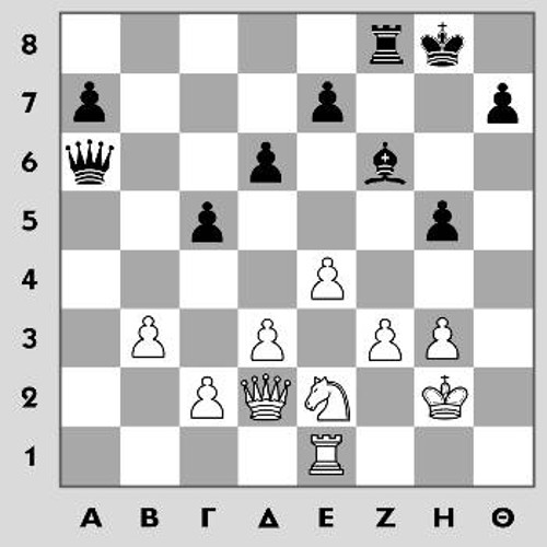 Μετά και από αυτήν την κίνηση η θέση του λευκού γίνεται πολύ δύσκολη. Καλύτερο θα ήταν το 19. Ιη3 αν και μετά από 19... Ιxη3 και 20... θ4 τα μαύρα διατηρούν την πρωτοβουλία 19...η5! Τα λευκά κομμάτια είναι εντελώς ασυντόνιστα, οπότε τα μαύρα αρχίζουν την επίθεση στον αντίπαλο Ρ Βασιλιά 20. Παδ1 Πxδ1 21. Πxδ1 Βα8! Εντυπωσιακή κίνηση που φέρνει την μαύρη Β στην επίθεση, από το πιο απομακρυσμένο από τον λευκό Βασιλιά τετράγωνο της σκακιέρας! 22. Αγ7 θ4 23. ζ3 θ3 και τα λευκά εγκαταλείπουν γιατί η θέση του Βασιλιά τους ανοίγει πλήρως για τα μαύρα κομμάτια. Π.χ. 24. Πδ3 θxη2 25. Ρxη2 η4 0-1.