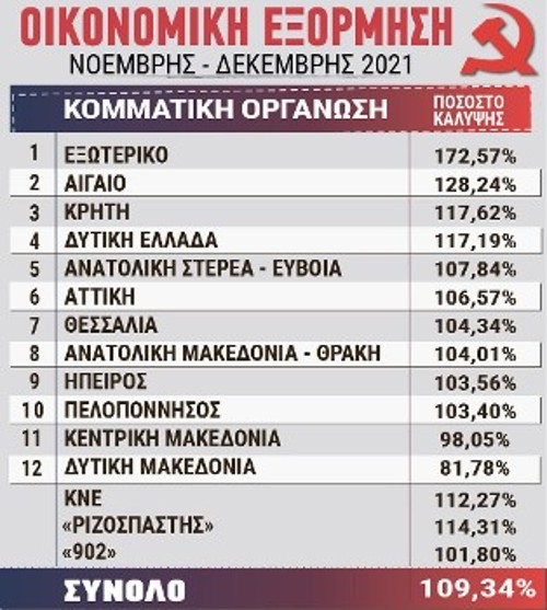 Η ΚΝΕ υπερκαλύπτει το πλάνο στο 112,27%. Επίσης, η ΚΟ «Ριζοσπάστη» έχει φτάσει στο 114,31% του πλάνου της και η ΚΟ «902» στο 101,80%.