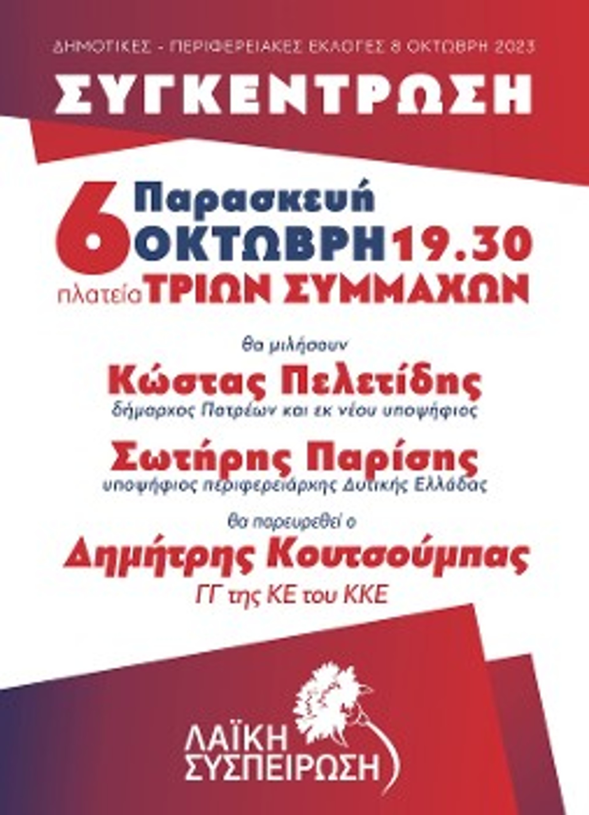 Στην τελική ευθεία βρίσκονται και οι προετοιμασίες για τη μεγάλη προεκλογική συγκέντρωση της «Λαϊκής Συσπείρωσης» την Παρασκευή 6 Οκτώβρη, στην πλατεία Τριών Συμμάχων στις 7.30 μ.μ., με ομιλίες του δημάρχου και εκ νέου υποψήφιου Κώστα Πελετίδη και του υποψηφίου περιφερειάρχη Δυτικής Ελλάδας Σωτήρη Παρίση, ενώ θα παρευρεθεί και ο ΓΓ της ΚΕ του ΚΚΕ Δημήτρης Κουτσούμπας.