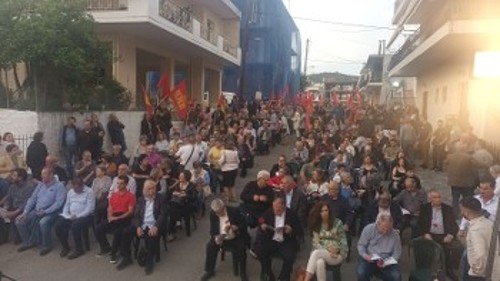 Την κεντρική ομιλία πραγματοποίησε ο Σωτήρης Παρίσης, μέλος της ΚΕ του ΚΚΕ και Γραμματέας της ΕΠ Δυτ. Ελλάδας, ενώ νωρίτερα απηύθυναν χαιρετισμούς ο Σπύρος Κοτοπούλης, μέλος της Τομεακής Επιτροπής Αιτωλοακαρνανίας του Κόμματος και πρόεδρος της Ομοσπονδίας Αγροτικών Συλλόγων του νομού, η Βάνα Πατρινού, υποψήφια ευρωβουλευτής του ΚΚΕ, και ο Ανδρέας Φαρμάκης, τελευταίος πρόεδρος του Σωματείου Καπνεργατών - Καπνεργατριών στην πόλη.