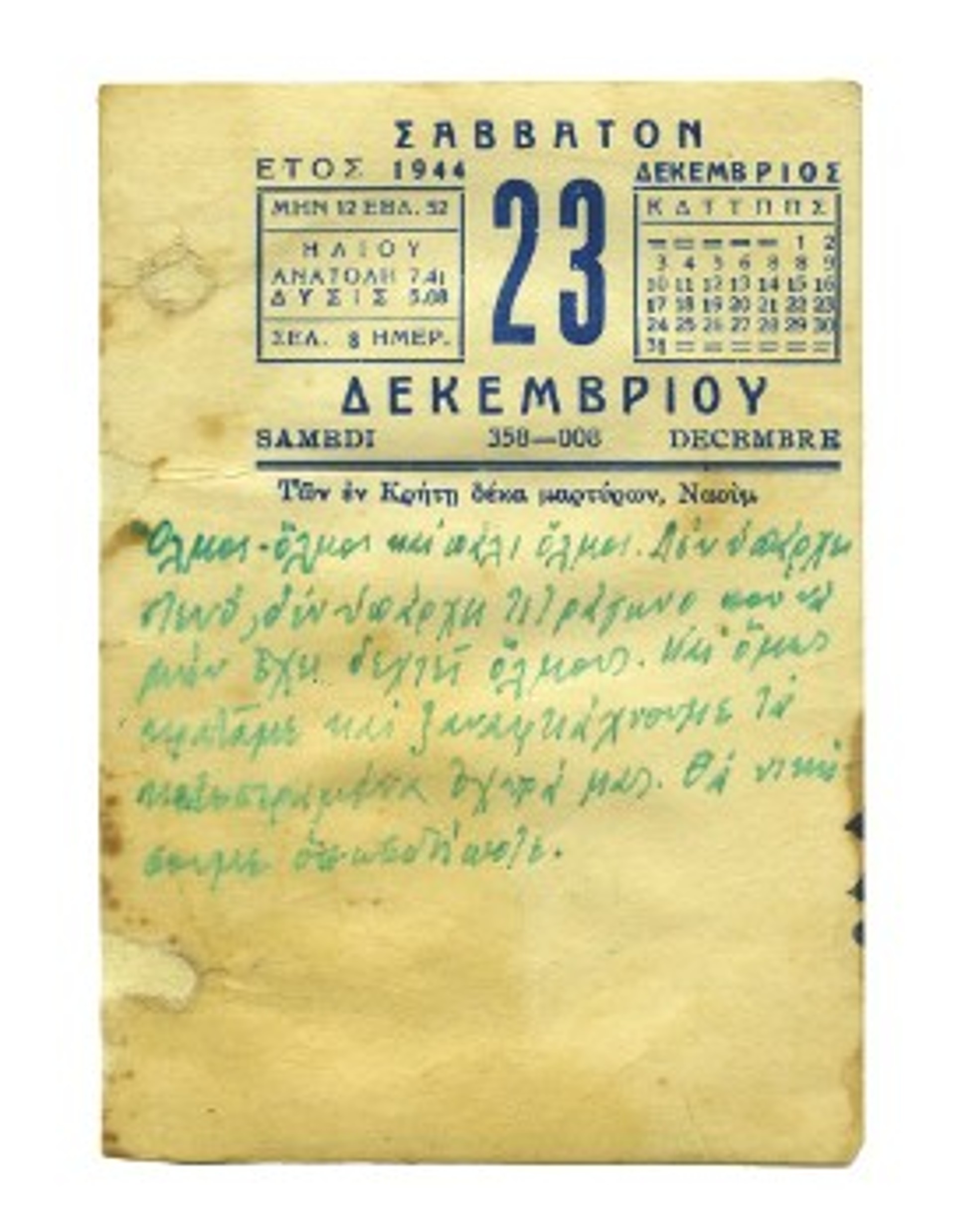 Χαρακτηριστικά, στη σελίδα με ημερομηνία 23 Δεκέμβρη γράφεται: «Ολμοι, όλμοι και πάλι όλμοι. Δεν υπάρχει στενό, δεν υπάρχει τετράγωνο που να μην έχει δεχτεί όλμους. Κι όμως κρατάμε και ξαναφτιάχνουμε τα κατεστραμμένα οχυρά μας. Θα νικήσουμε οπωσδήποτε».