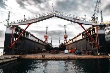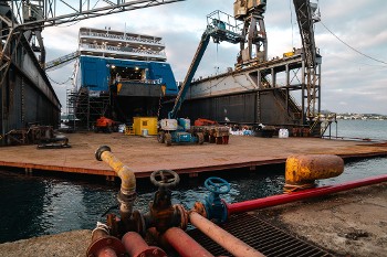 Πρώτος σταθμός μας στο οδοιπορικό, μια μεγάλη πλωτή δεξαμενή στην οποία έχει τοποθετηθεί μια μικρότερη για συντήρηση και επισκευή. «Αυτά είναι τα βάζα», μας λέει ο Σταύρος Τουμανίδης, δείχνοντας κάποιες κατασκευές από σίδερο και ξύλο. Οταν έρχεται ένα πλοίο η δεξαμενή βυθίζεται, το πλοίο στηρίζεται πάνω στα «βάζα», δύτες ελέγχουν και αφού βεβαιωθούν ότι η στήριξη είναι σωστή η δεξαμενή αναδύεται και αδειάζει από το νερό για να ξεκινήσουν οι εργασίες στο πλοίο.