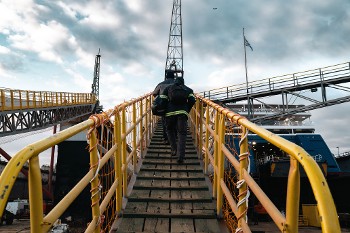 Βγαίνουμε από τη δεξαμενή και προχωράμε κατά μήκος της προβλήτας. Από ένα πλοίο που έχει πλαγιοδετήσει κατεβαίνει ο Γιώργος, ναυπηγοξυλουργός. Δουλεύει στη Ζώνη από το 2016. Πριν δούλευε οικοδομή, στα μπετά. Το Σωματείο Ναυπηγοξυλουργών ήρθε άμεσα σε επαφή μαζί του. Μετά από λίγο καιρό στη δουλειά ο εργολάβος του ζήτησε να δουλεύει σαν μάστορας. Οταν ο Γιώργος ζήτησε να πληρώνεται ως μάστορας και όχι ως βοηθός τον έδιωξε με την δικαιολογία ότι δεν υπήρχε δουλειά...