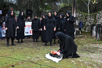Με τη δύναμη μιας αρχαίας τραγωδίας αλλά με την εικόνα της Ελλάδας των διώξεων, των φυλακίσεων, των εκτελέσεων αγωνιστών... Με τις μαυροφορεμένες γυναίκες και το μοιρολόι της μάνας για τον γιο της που δολοφονήθηκε, εκτελέστηκε... Με την μάνα να γονατίζει μπροστά στο χιτώνιο του γιου της και τη σημαία του ΚΚΕ. Και το μοιρολόι να ξετυλίγεται...