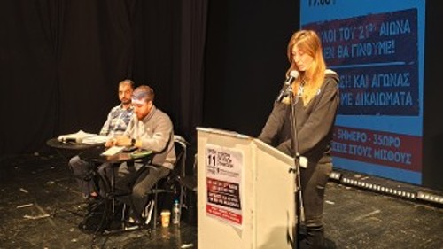 Εισηγητικά η Λίλη Μαραγκού, πρόεδρος του Σωματείου Εργαζομένων της «Pfizer», αναφέρθηκε στις δύο μεγάλες απεργιακές μάχες που δόθηκαν με επιτυχία τον περασμένο Οκτώβρη, κόντρα σε κυβέρνηση, εργοδοσία, ΓΣΕΕ, τονίζοντας ότι αποτελούν σημαντική παρακαταθήκη, προσθέτουν πείρα για το επόμενο διάστημα. Οπως είπε, «χώροι εργασίας κλείσανε, όπως στον "Μύθο", το Flyover, το εργοτάξιο του Παιδιατρικού, τα Μεταλλεία Χαλκιδικής. Αρκετοί χώροι υπολειτούργησαν λόγω των υψηλών ποσοστών απεργίας όπως Μετρό και "Cosmote".