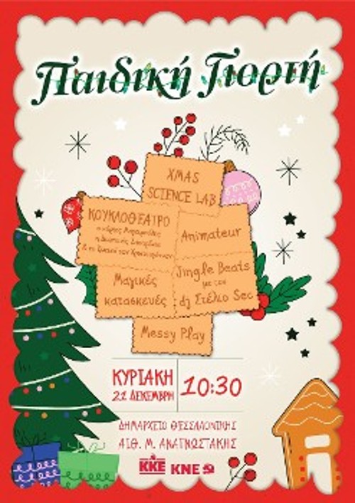 Επίσης την Κυριακή 21 Δεκέμβρη, στις 10.30 π.μ. στο δημαρχείο Θεσσαλονίκης (αίθουσα «Μ. Αναγνωστάκης»), θα πραγματοποιήσουν την καθιερωμένη παιδική γιορτή οι Οργανώσεις Κεντρικής Μακεδονίας του ΚΚΕ και της ΚΝΕ.