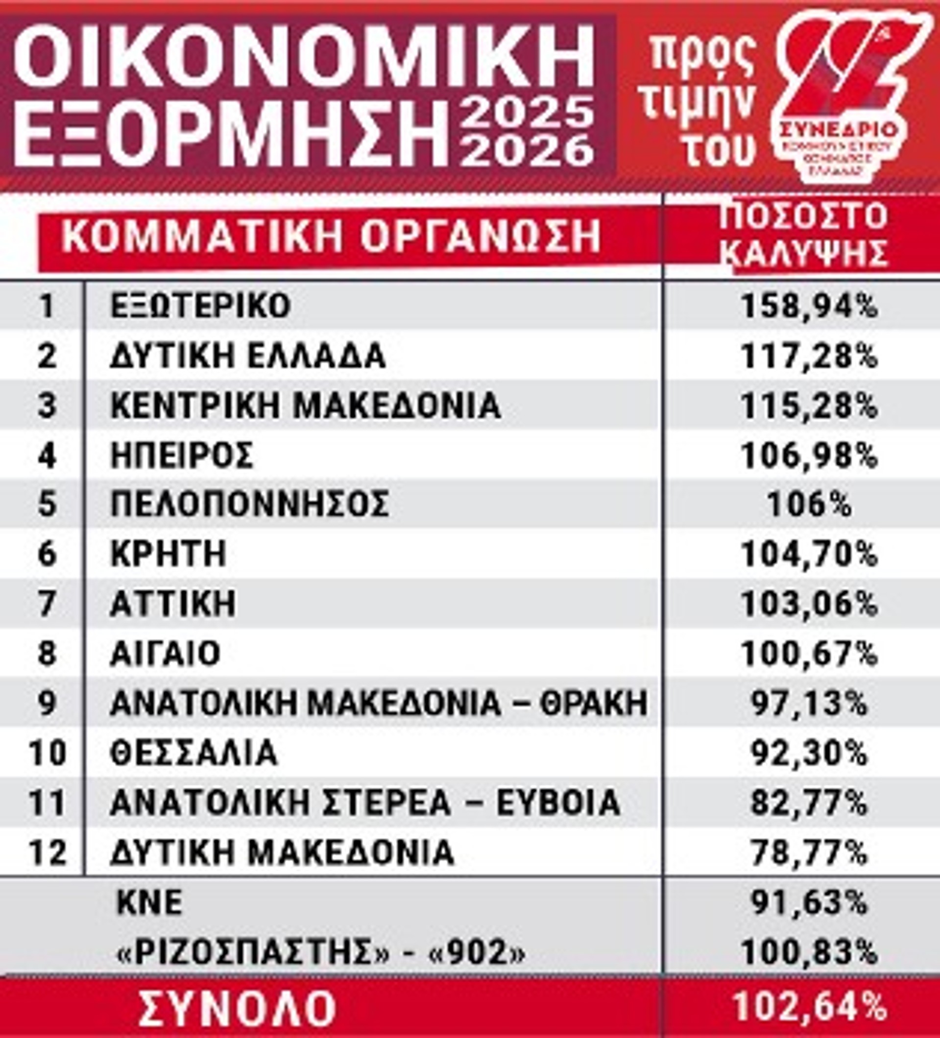 Η ΚΝΕ έχει καλύψει το 91,63% του πλάνου της και η ΚΟΒ «Ριζοσπάστη» - «902» έχει υπερκαλύψει στο 100,83% του δικού της.