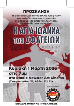Την παράσταση «Η Αγία Ιωάννα των Σφαγείων», του Μπ. Μπρεχτ, παρουσιάζει η Θεατρική Ομάδα του ΠΑΜΕ προς τιμήν των φιλοξενούμενων αγωνιστών στο ίδρυμα «Το Σπίτι του Αγωνιστή».