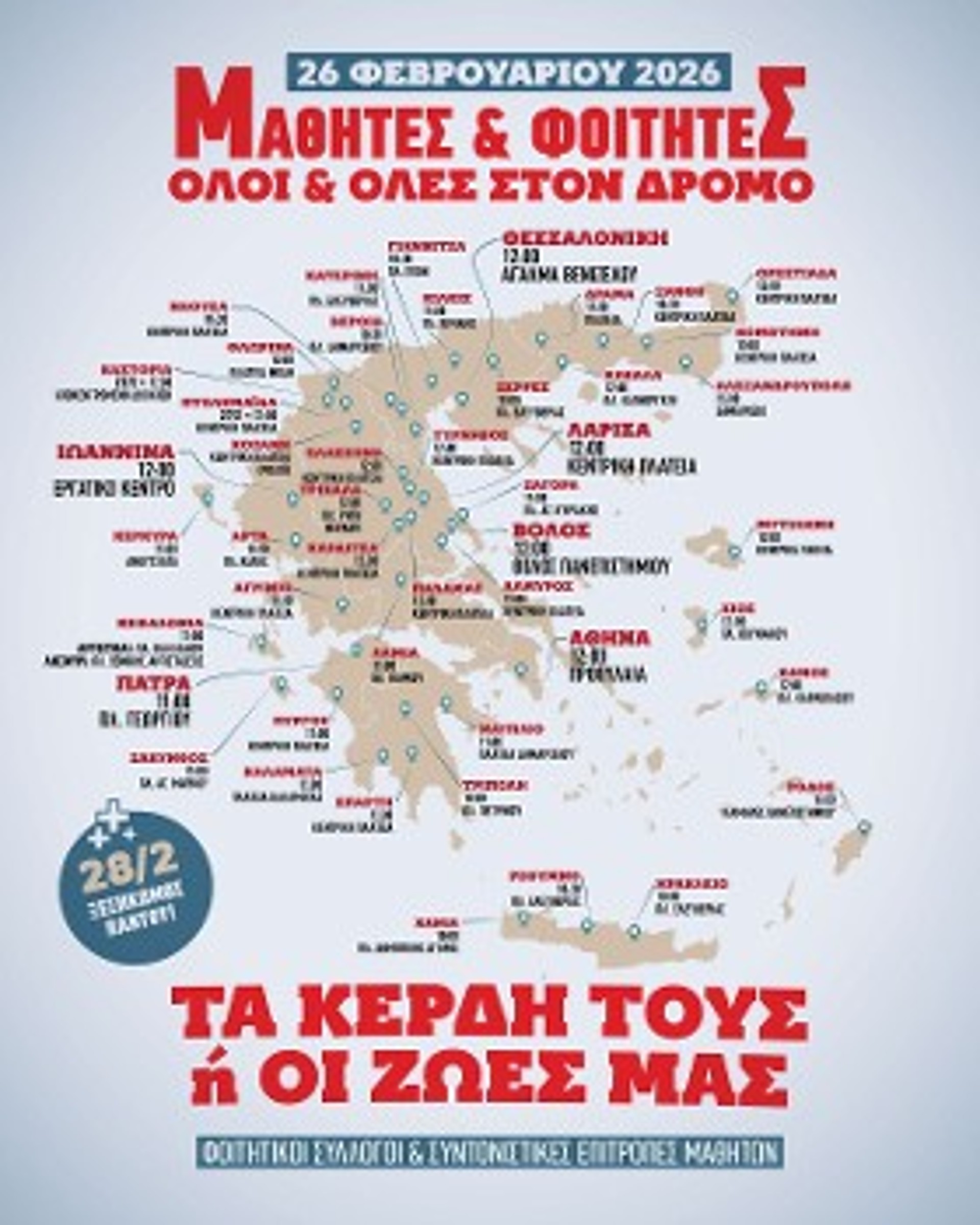 Οπως μας λέει η Ευαγγελία, μέλος του 15μελούς του 9ου ΓΕΛ Αθηνών και της Συντονιστικής Επιτροπής Μαθητών Αθήνας: «Στις 26/2 οι μαθητές θα κλείσουμε τα σχολεία μας και θα είμαστε στους δρόμους σε όλη τη χώρα. Ο λόγος απλός: Το σύνθημα "Τα κέρδη τους ή η ζωές μας" είναι παντού γύρω μας. Το σύστημα του κέρδους, που είναι με αίμα ποτισμένο από τα 57 παιδιά στα Τέμπη, που εμείς δεν τα έχουμε ξεχάσει και θα τιμωρήσουμε όλους τους ενόχους, κράτος, κυβερνήσεις, εταιρεία, υπουργούς, είναι αυτό που καθορίζει κάθε πλευρά της ζωής μας.