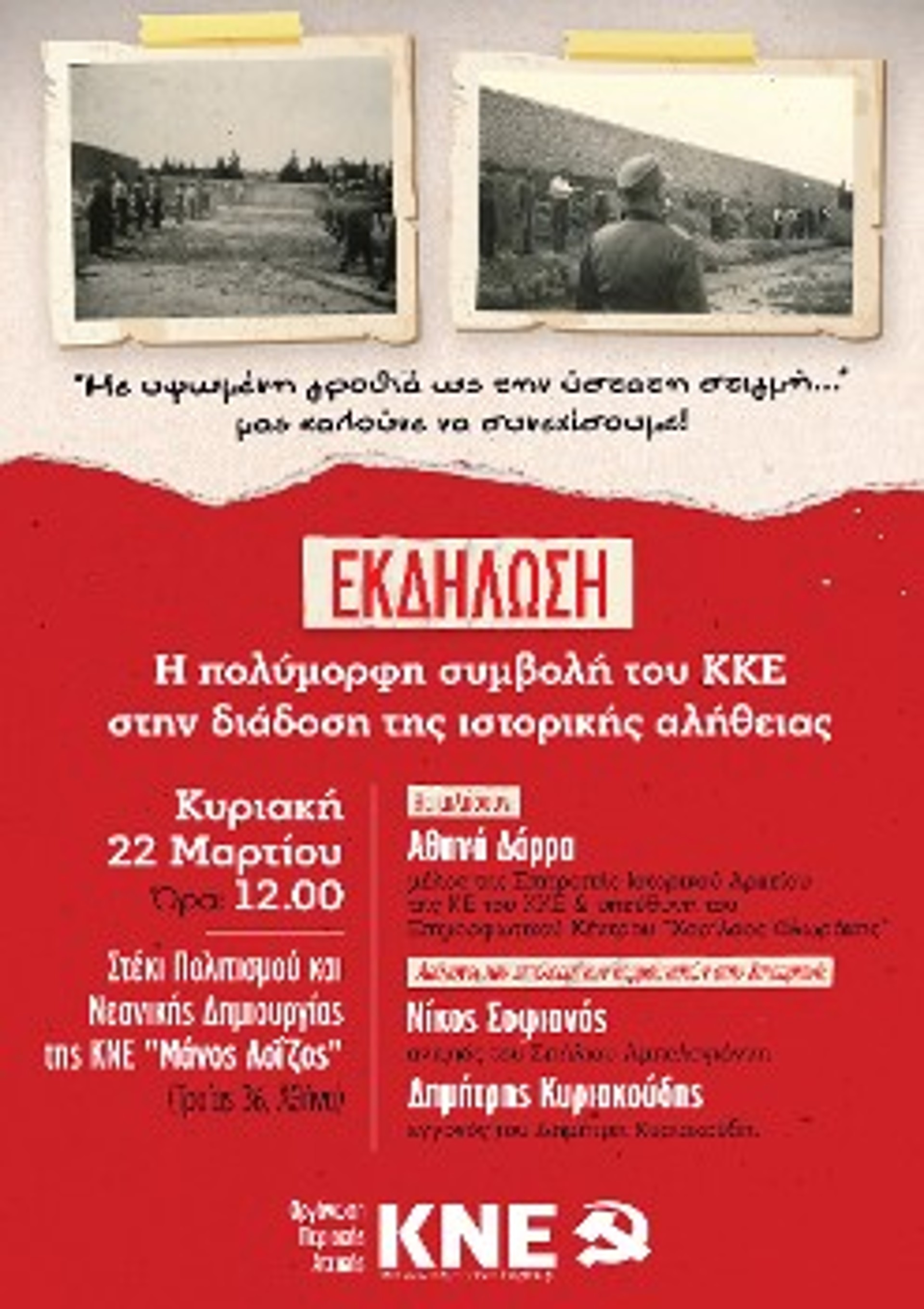 Στο πλαίσιο αυτό, την Κυριακή 22 Μάρτη, στις 12.00 στο Στέκι Πολιτισμού και Νεανικής Δημιουργίας της ΚΝΕ «Μάνος Λοΐζος», οργανώνει συζήτηση με θέμα «Με υψωμένη γροθιά έως την ύστατη στιγμή... Μας καλούνε να συνεχίσουμε! Η πολύμορφη συμβολή του ΚΚΕ στη διάδοση της ιστορικής αλήθειας».