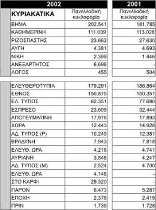 Να διευκρινίσουμε για την κατανόηση των πινάκων ότι για ένα διάστημα κυκλοφόρησαν δύο «Ελεύθερες Ωρες». Στη διάρκεια της χρονιάς εκδόθηκε και έκλεισε ο «Ανεξάρτητος» και η δεύτερη «Ελεύθερη Ωρα». Το «Καρφί» το 2001 ήταν ημερήσιο αρχικά και στη συνέχεια έγινε κυριακάτικο. Ακόμα, κάποιες εφημερίδες κυκλοφορούν μόνο την Κυριακή.