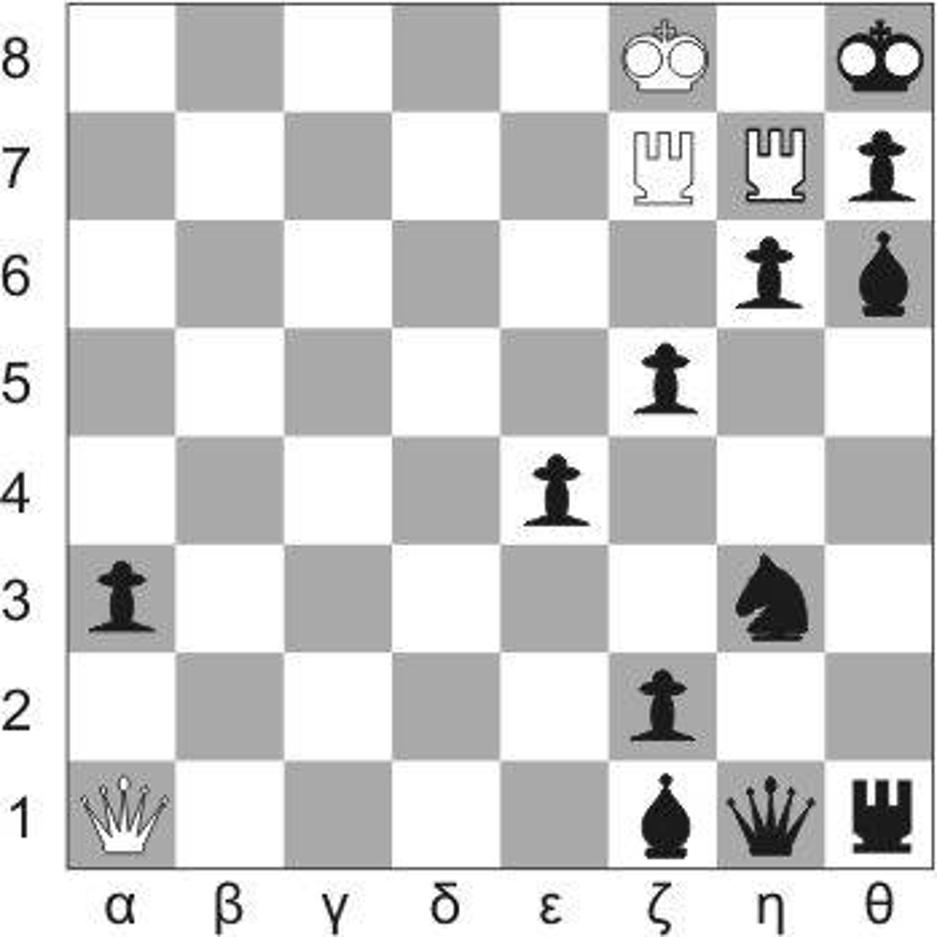 α) Λευκά: Ρη1, Βε2, Πα1, Πδ1, Ιε4, Αη4, Αγ1, Στρ. α3, β2, ζ2, η2, θ2 (12) Μαύρα: Ρε8, Βη6, Πα8, Πθ8, Ιβ8, Ιε7, Αα5, Στρ. α7, β7, γ6, γ4, ζ7, η7, θ7 (14)