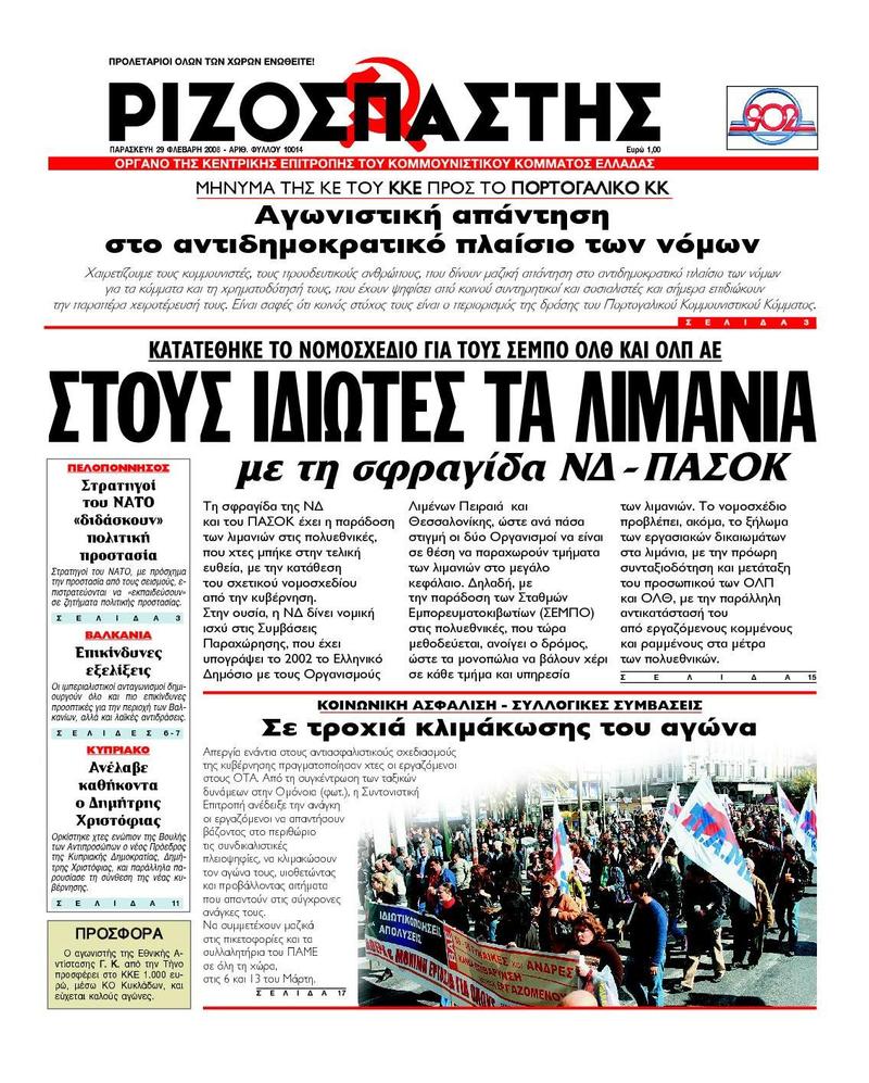 Τη σφραγίδα της ΝΔ και του ΠΑΣΟΚ έχει η παράδοση των Λιμανιών στις πολυεθνικές, που χτες μπήκε στην τελική ευθεία, με την κατάθεση του σχετικού νομοσχεδίου από την κυβέρνηση. Στην ουσία, η ΝΔ δίνει νομική ισχύ στις Συμβάσεις Παραχώρησης, που έχει υπογράψει το 2002 το Ελληνικό Δημόσιο με τους Οργανισμούς Λιμένων Πειραιά και Θεσσαλονίκης, ώστε ανά πάσα στιγμή οι δύο Οργανισμοί να είναι σε θέση να παραχωρούν τμήματα των Λιμανιών στο μεγάλο κεφάλαιο. Δηλαδή, με την παράδοση των Σταθμών Εμπορευματοκιβωτίων στις πολυεθνικές, που τώρα μεθοδεύεται, ανοίγει ο δρόμος, ώστε τα μονοπώλια να βάλουν χέρι σε κάθε τμήμα και υπηρεσία των Λιμανιών. Το νομοσχέδιο προβλέπει, ακόμα, το ξήλωμα των εργασιακών δικαιωμάτων στα Λιμάνια, με την πρόωρη συνταξιοδότηση και μετάταξη του προσωπικού των ΟΛΠ και ΟΛΘ, με την παράλληλη αντικατάστασή του από εργαζόμενους κομμένους και ραμμένους στα μέτρα των πολυεθνικών.