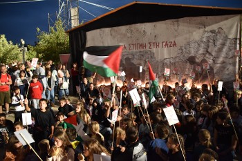 Με τραγούδια, φωνές και πικέτες στα χρώματα της Παλαιστίνης κατευθύνθηκαν αρχικά στο περίπτερο Συλλόγου Πολιτισμού «Παύλος Κillah p Φύσσας», όπου συνάντησαν την Μάγδα Φύσσα και της προσέφεραν την έκδοση «Ο Β' Παγκόσμιος Πόλεμος και η Αντιφασιστική Νίκη των Λαών. Ποιος; Πού; Πότε; Γιατί;».