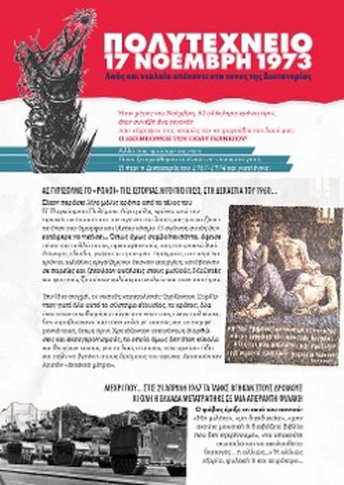 «Λίγα μόλις χρόνια μετά από την ηρωική αντίσταση και τον αγώνα του λαού μας για να ζήσει σε έναν πιο όμορφο και δίκαιο κόσμο, οι νικητές καπιταλιστές ζορίζονταν. Ζορίζονταν γιατί όλο αυτό το σύστημα εξουσίας, το κράτος, όλα όσα είχαν οικοδομήσει πάνω στη νίκη τους είχαν παλιώσει, δεν "τραβούσαν" πια τόσο καλά γι' αυτούς και τα συμφέροντά τους, όπως πριν. Χρειάζονταν επειγόντως διορθώσεις και εκσυγχρονισμούς, τα οποία όμως δεν ήταν εύκολα και θα είχαν κόστος για τον λαό, ο οποίος είχε αρχίσει ήδη και πάλι να βγαίνει στους δρόμους του αγώνα. Απαιτούνταν λοιπόν "έκτακτα μέτρα". Μέχρι που... στις 21 Απρίλη 1967 τα τανκς βγήκαν στους δρόμους κι όλη η Ελλάδα μετατράπηκε σε μια απέραντη φυλακή. Ομως, μέσα και σ' αυτές τις δύσκολες συνθήκες κάποιοι δεν φοβήθηκαν, μπήκαν μπροστά κι οργάνωσαν την αντίσταση του λαού. Δεν ήταν εύκολο. Ούτε έγινε από τη μία μέρα στην άλλη. Χρειάστηκε πολλή - πολλή δουλειά για να καρποφορήσει το δέντρο της αντιδικτατορικής πάλης... και καρποφόρησε! Η ίδρυση της Κομμουνιστικής Νεολαίας Ελλάδας, το 1968 μέσα στη δικτατορία, έπαιξε σημαντικό ρόλο στο να φουντώσουν οι αγώνες στα σχολεία και τα Πανεπιστήμια. Τελικά, 17 Νοέμβρη του '73 το Πολυτεχνείο έπεσε κάτω από το βάρος των όπλων της δικτατορίας. Ομως, αυτό που δεν καταλάβαιναν ακόμα οι δικτάτορες, είναι πως το Πολυτεχνείο ήταν κι η αρχή του δικού τους τέλους, που ήρθε λίγους μήνες μετά. Η θυσία των ηρώων του Πολυτεχνείου δεν πήγε χαμένη. Ηταν ο σπόρος της λευτεριάς που άνθισε λίγο αργότερα. Οι ήρωες αυτοί είναι ζωντανοί, γιατί τους κρατάμε ζωντανούς στις καρδιές μας! Γιατί συνεχίζουμε στα βήματά τους με τους δικούς μας αγώνες!».