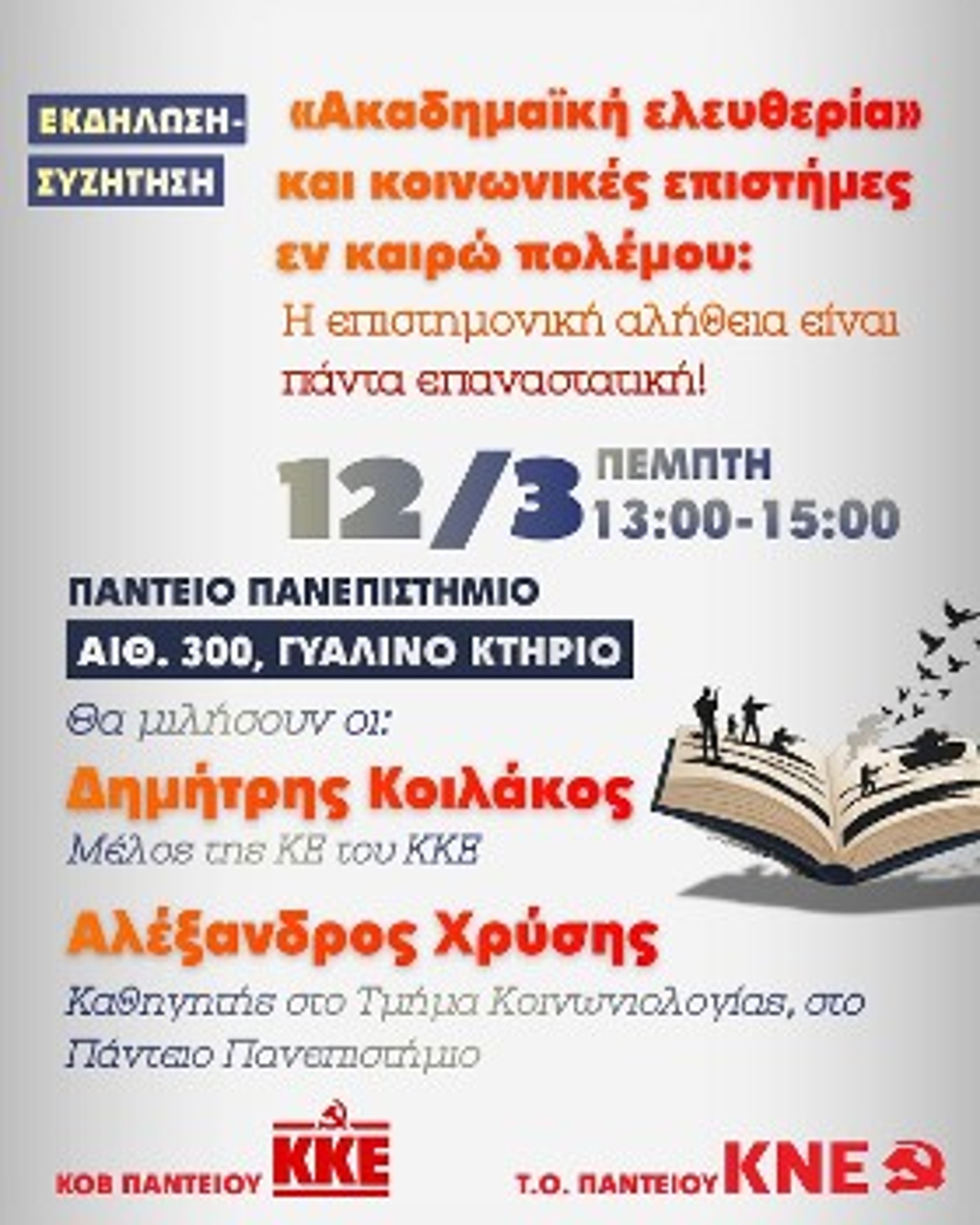 Η εκδήλωση πραγματοποιείται στις 13.00 στην Αίθουσα 300 στο Πάντειο Πανεπιστήμιο, με ομιλητές τους Δημήτρη Κοιλάκο, μέλος της ΚΕ του ΚΚΕ και Αλέξανδρο Χρύση, Καθηγητή στο Τμήμα Κοινωνιολογίας στο Πάντειο.