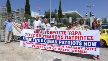 Παράσταση διαμαρτυρίας στην αμερικάνικη πρεσβεία διοργάνωσαν χτες το μεσημέρι ο Ελληνοκουβανικός Σύνδεσμος Φιλίας και Αλληλεγγύης, η Ελληνική Επιτροπή για τη Διεθνή Υφεση και Ειρήνη (ΕΕΔΥΕ), η Ελληνική Επιτροπή Διεθνούς Δημοκρατικής Αλληλεγγύης (ΕΕΔΔΑ) και η Ομοσπονδία Γυναικών Ελλάδας, με αφορμή τη συμπλήρωση 15 χρόνων από τη φυλάκιση στις ΗΠΑ των πέντε Κουβανών πατριωτών. Οι αγωνιστές αυτοί (ένας εκ των οποίων, ο Ρενέ Γκονζάλες, έχει ήδη αποφυλακισθεί μετά από 13 χρόνια στη φυλακή) διώχθηκαν άδικα γιατί διείσδυσαν στις οργανώσεις της αντικουβανικής μαφίας του Μαϊάμι και αποκάλυψαν τις εγκληματικές ενέργειες που σχεδιάζει κατά του Νησιού της Επανάστασης. Οι αντιπροσωπείες επέδωσαν σε...