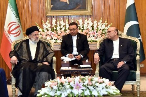 Σήμερα ολοκληρώνει τις επίσημες επαφές που άρχισε τη Δευτέρα στο Πακιστάν ο Ιρανός Πρόεδρος Ιμπραχήμ Ραϊσί, που έφτασε στο Ισλαμαμπάντ συνοδευόμενος από διάφορα στελέχη της κυβέρνησής του. Στη συνάντηση που είχε με τον Πακιστανό ομόλογό του, Ασίφ Αλί Ζαρντάρι, ο Ραϊσί μίλησε πάντως για αποφασιστικότητα των δύο πλευρών να αναπτύξουν περαιτέρω τις διμερείς εμπορικές και οικονομικές σχέσεις, προσθέτοντας ότι η διασφάλιση σταθερότητας και ασφάλειας στην περιοχή αποτελεί προϋπόθεση για την επίτευξη και των οικονομικών τους στόχων. Η επίσκεψη γίνεται μετά την ένταση που είχε προκύψει τον Γενάρη στις διμερείς σχέσεις (με ανάκληση και διπλωματών), όταν το Ιράν έπληξε στόχους (όπως είπε)...