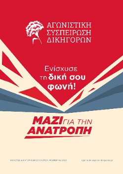 Κυκλοφόρησε η Διακήρυξη της «Αγωνιστικής Συσπείρωσης» Δικηγόρων για τις δικηγορικές εκλογές, που διεξάγονται πανελλαδικά στις 30 Νοέμβρη - 1η Δεκέμβρη και αφορούν πάνω από 40.000 δικηγόρους σε 63 Δικηγορικούς Συλλόγους. Με σύνθημα «Ενίσχυσε τη δική σου φωνή! Μαζί για την ανατροπή!», η «Αγωνιστική Συσπείρωση Δικηγόρων» καλεί τους χιλιάδες αυτοαπασχολούμενους και μισθωτούς δικηγόρους να πάρουν την υπόθεση στα δικά τους χέρια, να στείλουν ηχηρό, μαχητικό μήνυμα ενάντια στην κυβέρνηση, στην πολιτική της ΕΕ, στους κάθε λογής «σωτήρες», στην αντιλαϊκή επίθεση και τις νέες αντιδραστικές εξελίξεις στη Δικαιοσύνη που συνθλίβουν τη ζωή και τα δικαιώματά τους. Οπως αναφέρει η Διακήρυξη: ***...
