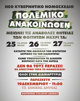 Απόσυρση του πολυνομοσχεδίου για τη μετάβαση των Ενόπλων δυνάμεων στη «Νέα Εποχή» ζητούν με ψήφισμά τους 23 Φοιτητικοί Σύλλογοι της Αθήνας, καταγγέλλοντας ιδιαίτερα τις δυσμενείς διατάξεις που φέρνει για τη θητεία στους φοιτητές, για τις αναβολές κ.λπ. και καλούν σε παράσταση διαμαρτυρίας στο υπουργείο Εθνικής Αμυνας, την Παρασκευή 19 Δεκέμβρη, στις 11 π.μ. Οι Σύλλογοι καταγγέλλουν ότι το νομοσχέδιο περιλαμβάνει διατάξεις με τις οποίες μειώνονται τα έτη αναβολής στράτευσης και συγκεκριμένα: «Με την προσαρμογή στον απαράδεκτο νόμο για τις διαγραφές φοιτητών, η χορήγηση αναβολών θα δίνεται μέχρι το 25ο έτος της ηλικίας για τις 4ετείς σχολές, το 26ο έτος για τις 5ετείς, το 27ο έτος για τις...