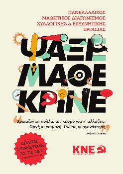 Πανελλαδικό Μαθητικό Διαγωνισμό Συλλογικής και Ερευνητικής Εργασίας προκηρύσσει η ΚΝΕ με το σύνθημα «Ψάξε, μάθε, κρίνε... Χρειάζονται πολλά, τον κόσμο για να αλλάξεις: Οργή κι επιμονή. Γνώση και αγανάκτηση... (Μ. Μπρεχτ)». Συλλογικές και ερευνητικές εργασίες με τη ματιά των μαθητών θα «διαγωνιστούν» και θα κριθούν με σκοπό τη γνώση αλλά και τη νίκη! Οι μαθητές φτιάχνουν ομάδες, διαλέγουν τη θεματική που θέλουν να συμμετέχουν και δηλώνουν συμμετοχή. Θα υπάρξουν συνολικά 5 νικήτριες ομάδες, 1 ανά κάθε θεματική ενότητα, που θα επιλεγούν από κριτική επιτροπή που θα αξιολογήσει όλες τις εργασίες. Η σύνθεση της κριτικής επιτροπής θα ανακοινωθεί εντός του μήνα. Οπως αναφέρεται στον «Οδηγητή»...