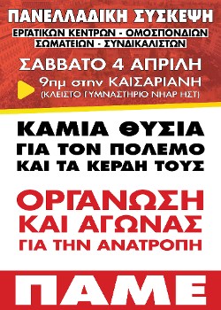 Με προμετωπίδα το σύνθημα «Καμία θυσία για τον πόλεμο και τα κέρδη τους. Οργάνωση και αγώνας για την ανατροπή», το ΠΑΜΕ οργανώνει τη μεγάλη Πανελλαδική Σύσκεψη Εργατικών Κέντρων, Ομοσπονδιών, Σωματείων και Συνδικαλιστών το Σάββατο 4 Απρίλη, στις 9 π.μ. στην Καισαριανή, στο κλειστό γήπεδο της Νήαρ Ηστ. Το ΠΑΜΕ απευθύνεται στα σωματεία καλώντας στη μεγάλη σύσκεψη, σε συνθήκες που ο ιμπεριαλιστικός πόλεμος κλιμακώνεται και γενικεύεται, τονίζοντας ότι «διέξοδο θα δώσει μόνο ο οργανωμένος λαός στον δρόμο για την ανατροπή αυτής της βαρβαρότητας». «Με ευθύνη της κυβέρνησης η χώρα εμπλέκεται σε έναν βάρβαρο πόλεμο που εξαπλώνεται στη Μέση Ανατολή, στη Μεσόγειο, και που μπορεί να γενικευτεί. Εχει...