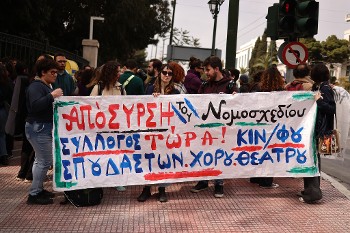 Μαζική παράσταση διαμαρτυρίας στο Μέγαρο Μαξίμου έκαναν χθες το πρωί σπουδαστές καλλιτεχνικών σχολών, μετά από κάλεσμα του Συλλόγου Σπουδαστών Σχολών Χορού, Θεάτρου και Κινηματογράφου, με αφορμή το νομοσχέδιο για την ίδρυση Ανώτατης Σχολής Παραστατικών Τεχνών, κόντρα στο οποίο ο Σύλλογος έλαβε πρωτοβουλίες από την πρώτη στιγμή, αναδεικνύοντας ότι το νέο πανεπιστήμιο που συγκροτείται είναι κοροϊδία! Με μια απλή συγκόλληση των πέντε κρατικών ανώτερων καλλιτεχνικών σχολών, χωρίς καμία μέριμνα για νέες, σύγχρονες υποδομές, με αοριστολογίες για τα προγράμματα σπουδών, χωρίς ουσιαστική πρόβλεψη για φοιτητική μέριμνα και παράλληλα χωρίς έναν αξιόπιστο αποδεκτό μηχανισμό αναβάθμισης και ισοτίμησης...