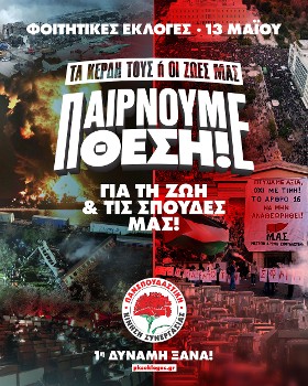 Στις 13 Μάη θα διεξαχθούν φέτος οι φοιτητικές εκλογές σε όλη τη χώρα, και οι εκλεγμένοι με την «Πανσπουδαστική Κίνηση Συνεργασίας» απευθύνουν κάλεσμα προς όλους τους φοιτητές και τις φοιτήτριες να δυναμώσουν τους Συλλόγους, να εκλεγούν περισσότεροι αγωνιστές εκπρόσωποι στα Διοικητικά Συμβούλια. «Τα κέρδη τους ή οι ζωές μας. Παίρνουμε θέση! Για τη ζωή και τις σπουδές μας! "Πανσπουδαστική ΚΣ" 1η δύναμη για ένα ισχυρό, πανελλαδικά συντονισμένο φοιτητικό κίνημα με κοινές διεκδικήσεις για τις σύγχρονες ανάγκες, σε σύγκρουση με την πολιτική των κερδών, με τις κυβερνήσεις και το σάπιο αντιλαϊκό κράτος που την υπηρετούν!», είναι το κάλεσμα που απευθύνεται πλατιά. Οπως αναφέρουν αναλυτικά: «Οι...