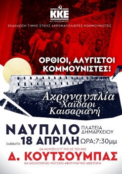 Πλατύ κάλεσμα στους εργαζόμενους, στον λαό, στη νεολαία να δώσουν δυναμικό «παρών» στη μεγάλη εκδήλωση με ομιλητή τον ΓΓ της ΚΕ του ΚΚΕ Δημήτρη Κουτσούμπα το Σάββατο 18 Απρίλη στο Ναύπλιο (7.30 μ.μ. στην πλατεία Δημαρχείου), τιμώντας τους χιλιάδες κομμουνιστές που ήταν φυλακισμένοι στην Ακροναυπλία, απευθύνει η Οργάνωση Περιοχής Πελοποννήσου του Κόμματος. Η εκδήλωση περιλαμβάνει μεταξύ άλλων αφηγήσεις και τραγούδια, έκθεση με υλικά από την Ακροναυπλία και ξενάγηση στον χώρο. Αγωνιστές δοκιμασμένοι σε σκληρές ταξικές μάχες «Ορθιοι, Αλύγιστοι, Κομμουνιστές! Ακροναυπλία - Χαϊδάρι - Καισαριανή», σημειώνει στο κάλεσμά της η Επιτροπή Περιοχής Πελοποννήσου, υπογραμμίζοντας: «Η εκτέλεση των 200...