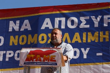 Εκεί, κάτω από συνθήματα, όπως «Οι εργατοπατέρες δεν βγήκαν στο μπαλκόνι, να δουν την εργατιά πώς διαδηλώνει», το λόγο έλαβε ο Θανάσης Κουτσουράς, πρόεδρος του Συνδικάτου Οικοδόμων Θεσσαλονίκης, σημειώνοντας: «Βρισκόμαστε εδώ στο ΕΚΘ, στο σπίτι της εργατικής τάξης, την έδρα των εργατικών σωματείων της πόλης, που δυστυχώς κινδυνεύει από την πλειοψηφία της ΠΑΣΚΕ, της ΔΑΚΕ και του ΣΥΡΙΖΑ να μετατραπεί από Εργατικό Κέντρο σε μνημείο εργατοπατερισμού. Είναι αυτοί που για σήμερα όχι απλά δεν άνοιξαν το στόμα τους να μιλήσουν σε εργαζόμενο, αλλά αρνήθηκαν να συγκαλέσουν τη διοίκηση του ΕΚ για να συζητήσει για το αν θα απεργήσουμε ή όχι (...) Είναι αυτοί, συνάδελφοι και συναγωνιστές, που σε λίγες μέρες θα βρίσκονται σε ένα πολυτελές τουριστικό θέρετρο στο Καβούρι για να κάνουν άλλη μια συμφωνία με την κυβέρνηση, ώστε αυτοί να κρατάνε καρέκλες σαν εργατοπατέρες και απ' την άλλη η κυβέρνηση και ο ΣΕΒ ανενόχλητοι να υλοποιούν πολιτικές για τα κέρδη τους».
