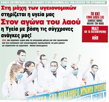 Ηδη οι παρεμβάσεις σωματείων και άλλων μαζικών φορέων είναι εκατοντάδες. Αυτή η προσπάθεια πρέπει να ενταθεί. Μόνο έτσι ο λαός δεν θα βγει φοβισμένος από την περιπέτεια που ζει, αντίθετα θα είναι έτοιμος να αναμετρηθεί και να παλέψει για όσα έχασε όχι λόγω της πανδημίας, αλλά συνολικά τα τελευταία χρόνια, για να προτάξει τις ανάγκες του. Γιατί έχει ήδη πληρώσει πολλά, δεν θα πληρώσει ξανά!