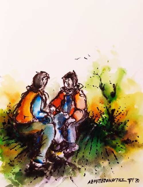 Ακου! Με εμπνέει ο καθαρός αέρας, η κλεφτουριά, η αγροτιά και η εργατιά, που έχει τα παιδιά της στο χακί και ανάβει κερί για να τα 'χει γερά και ζωντανά! Και με αυτά τα κολλυβογράμματα που έμαθα, στέλνω κανένα γράμμα και κανένα σχέδιο στο «Ριζοσπάστη», ειδικά αφιερωμένο για τα παιδιά που είναι ντυμένα στο χακί, μόνιμα και μη και βρίσκονται στην πρώτη γραμμή.