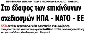 Δεν επιτρέπεται, συνεπώς, κανένας εφησυχασμός ούτε εμπιστοσύνη στην κυβέρνηση της ΝΔ, όταν μάλιστα είναι γνωστά τα αμερικανοΝΑΤΟικά σχέδια για συνεκμετάλλευση στο Αιγαίο και για επικίνδυνες διευθετήσεις στο Κυπριακό, που απ' ό,τι φαίνεται, μπαίνει κι αυτό στο παζάρι των φανερών ή παρασκηνιακών συζητήσεων».